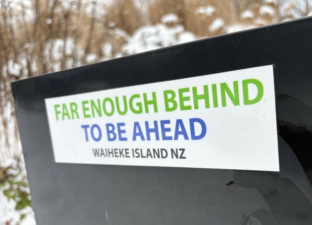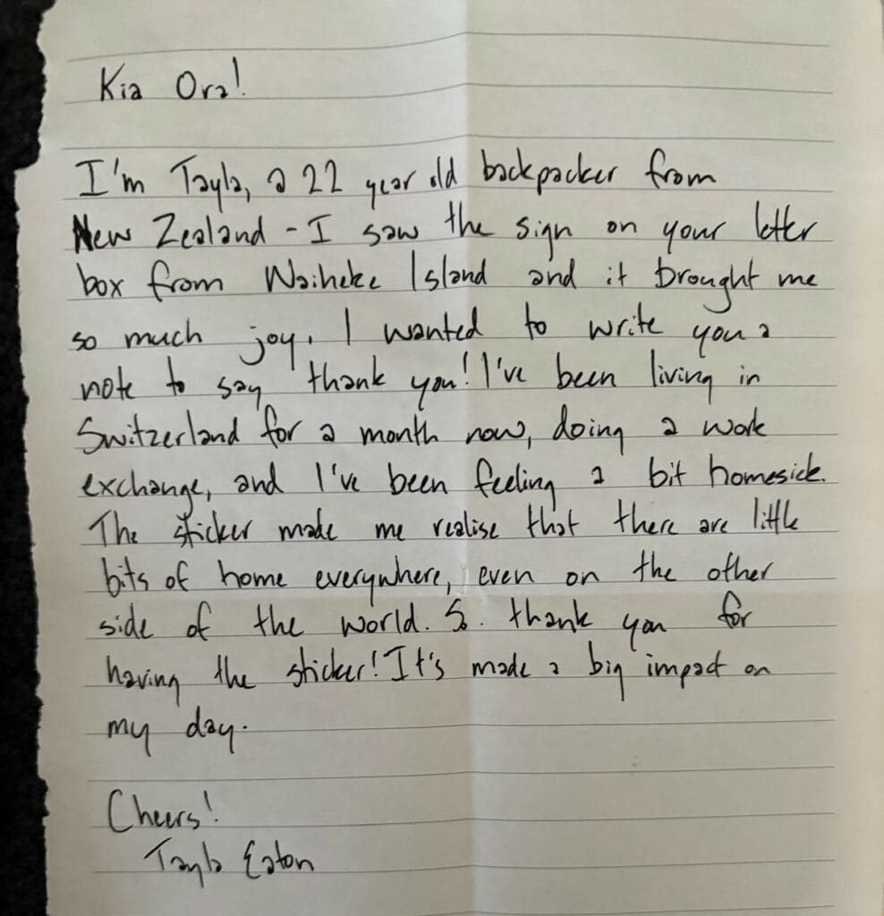 A 22 year old backpacker from New Zealand — Tayla – hinterliess uns eine Nachricht. Sie hatte unseren Sticker am Briefkasten gesehen: ”Far enough behind to be ahead – Waiheke Island» und schreibt: